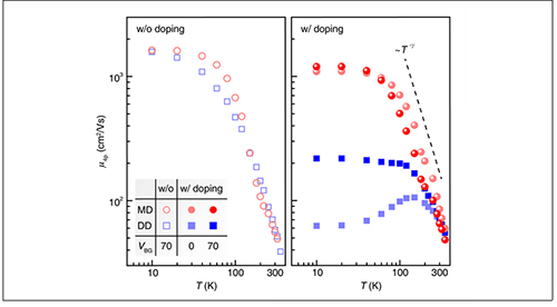 ▲ 변조 도핑(붉은색) 및 직접 도핑(파란색) 소자의 온도에 따른 전하이동도. (좌) 도핑 전 : 변조 도핑 소자를 위해 만들어진 구조와 직접 도핑 소자를 위해 만들어진 구조 모두 도핑 전에는 저온에서 전하 이동도 감소가 나타나지 않았다. 이는 두 소자 모두 도핑을 하지 않았기에 이온화된 불순물이 없어서 저온에서 전하산란 현상이 없기 때문이다. (우) 도핑 후 : 직접 도핑 소자에서 저온에서 전하 이동도의 감소 양상이 나타났다. 이는 이온화된 불순물에 의한 전하 산란 현상은 저온에서 두드러지게 나타나기 때문이다. 반면, 변조 도핑 소자에서는 저온에서 전하 이동도의 감소 양상이 나타나지 않았다. 이는 변조 도핑의 경우 이온화된 불순물이 채널 층에서 공간적으로 분리되어 전하 산란 현상이 억제되었기 때문이다.