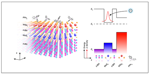 (오른쪽) 해당 구조의 에너지 밴드 정렬 모식도. 제시된 구조에서는 도핑을 통해 주입된 전자(그림에서 파란색 원으로 표시)는 층간 전하 이동을 통해 이황화몰리브덴(MoS2) 내부로 쉽게 전달되는 반면 공여체(PPh3)는 채널 층과 멀리 떨어질 수 있다.