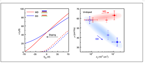 ▲ 변조 도핑 및 직접 도핑을 통해 제작한 소자의 전기적 특성. (좌) 도핑 소자의 게이트 전압에 따른 전기전도도 측정 결과(상온 조건). 변조 도핑 소자와 직접 도핑 소자 모두 도핑에 의해 채널의 전기전도도가 증가하는 양상을 보여주었다. (우) 도핑 소자의 도핑 농도에 따른 전하 이동도 측정 결과. 변조 도핑의 경우 도핑 농도가 증가해도 전하 이동도의 변화가 없는 반면, 직접 도핑의 경우 도핑 농도가 증가에 따라 전하 이동도가 낮아졌다.