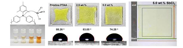△ 삼염화안티몬(SbCl₃) 도핑을 통해 정공 수송층(PTAA)의 젖음성이 향상됨에 따라, 막 균일성이 향상되고 슬롯다이 코팅을 활용한 대면적 균일 박막 형성이 가능함을 보여줌