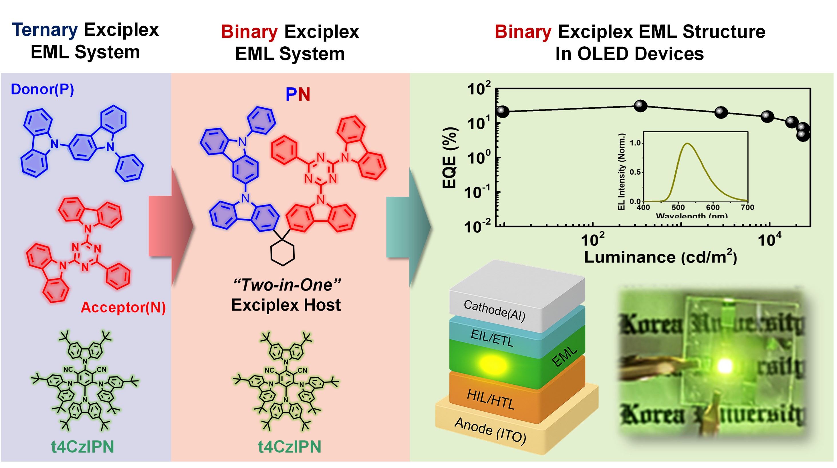 일반적으로 고성능 OLED 구현을 위해서는 도너, 억셉터, 발광체 세 가지를 정밀하게 조합한 엑시플렉스 기반 발광층이 필요하며, 이들을 동시에 혼합해 박막을 형성하고 각각의 농도를 정밀하게 조절해야 하는 복잡한 공정이 요구된다. 이러한 방식은 대량 생산이나 제품 간 성능 편차 등의 한계를 지닌다.