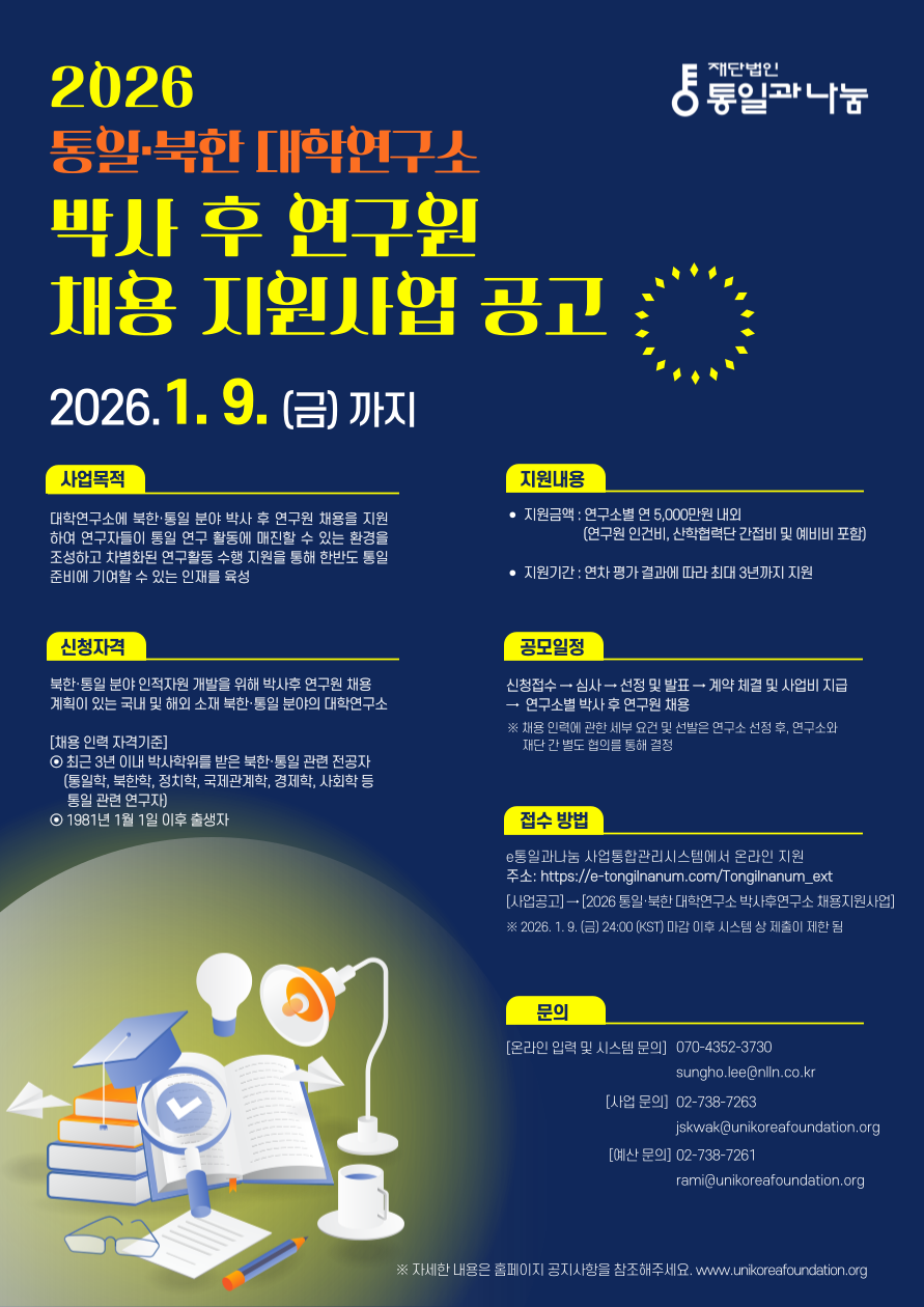※ 채용 인력에 관한 세부 요건 및 선발은 연구소 선정 후, 연구소와 통일과나눔 재단 간 별도 협의를 통해 결정